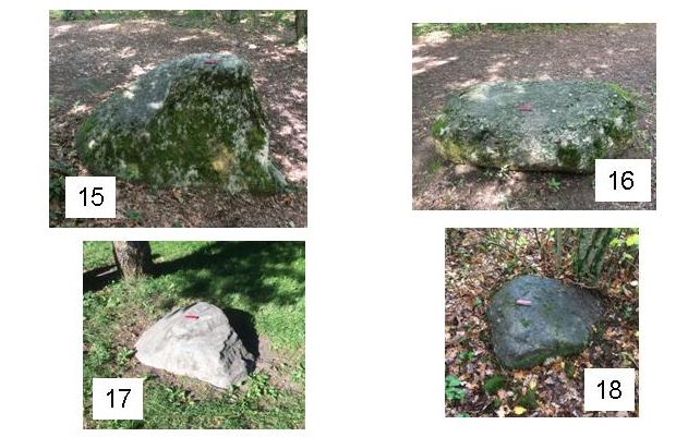 - 15 et 16 granit, roche magmatique, composée de quartz, feldspaths, micas, en provenance du Mont Blanc. -17 éclogite, roche métamorphique , en provenance de Zermatt. -18 en attente d'identification