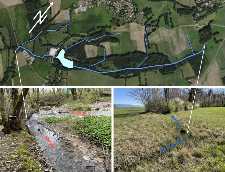 Entre Grilly et Cessy ŕ la limite de Sauverny et Versonnex Le ruisseau du Marais et ces petits affluents alimentent en eau le marais de Tutegny puis l’étang de Cessy et finalement il rejoint l’Oudar. Parcours ~2.5Km